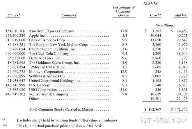 我们在此排除了卡夫亨氏的持股(325,442,152股),因为伯克希尔本身也是一家控股集团,因此必须用“股权”的方法来解释这笔投资。