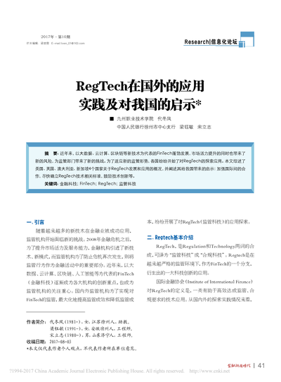 RegTech在国外的应用实践及对我国的启示_代冬凤
